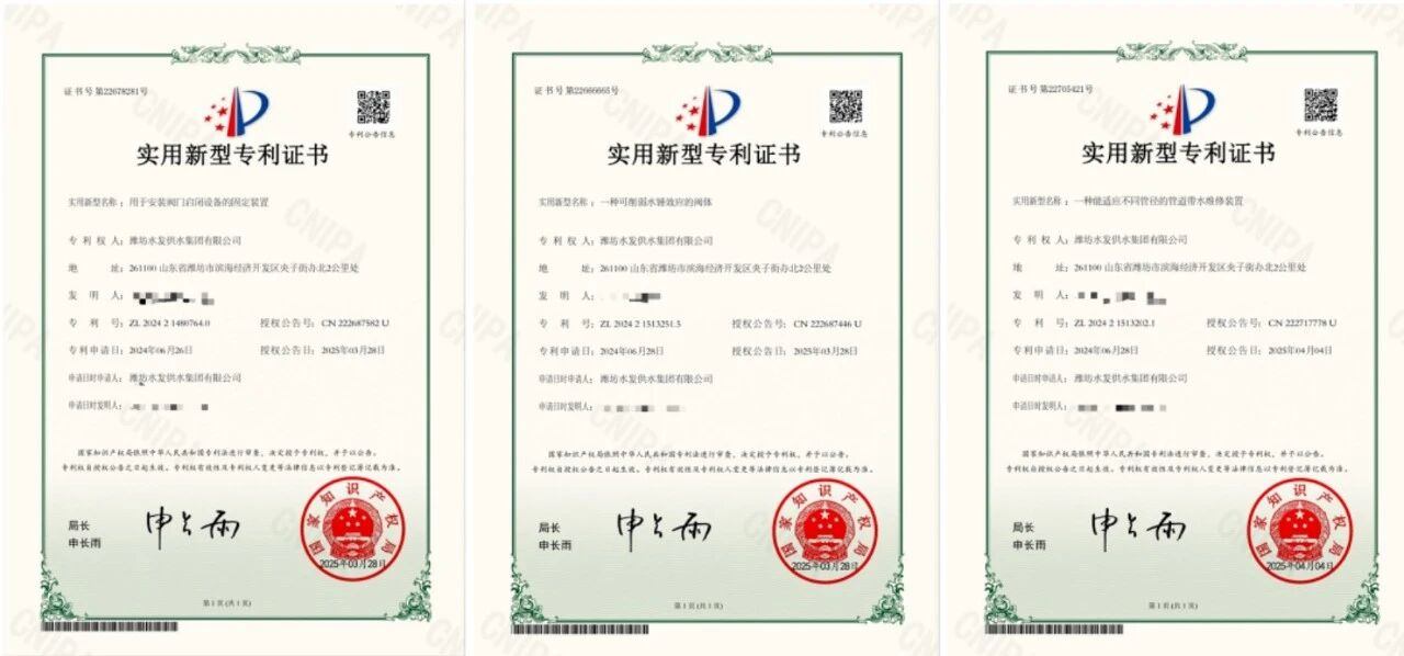 此外,濰坊區(qū)域還新增3項實用新型專利,涵蓋設(shè)備安裝、系統(tǒng)防護與維修維護等多個應(yīng)用場景:《用于安裝閥門啟閉設(shè)備的固定裝置》提升了復(fù)雜環(huán)境下的施工效率;《一種可削弱水錘效應(yīng)的閥體》增強了供水系統(tǒng)穩(wěn)定性;《一種能適應(yīng)不同管徑的管道帶水維修裝置》實現(xiàn)了高效不停水維修。三者與前述發(fā)明專利、軟著協(xié)同發(fā)力,初步構(gòu)建起“檢測-控制-維護”的水務(wù)管網(wǎng)技術(shù)創(chuàng)新體系。